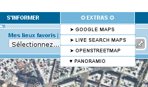 Les fonctionnalités apportées se présentent sous la forme d'un sous-menu supplémentaire ajouté à la barre de navigation du GeoPortail. Ce sous-menu "Extras" permet à ce jour de voir l'équivalent de la vue en cours (en 2D ou 3D) sous d'autres sites cartographiques :