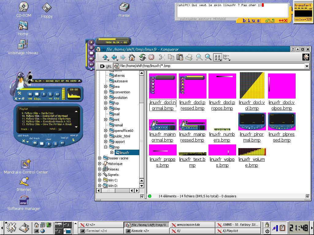 Soumis par Shift le lun 17/04/2006 - 00:22 Si vous voulez la panoplie complète de la "moule de tribune libre" de linuxfr.org, je vous ai confectionné un petit skin kjofol aussi (et surtout) utilisable sous xmms via le plugin kjofol. Une petite capture d'écran : Une plus grande Download Le skin linuxfr